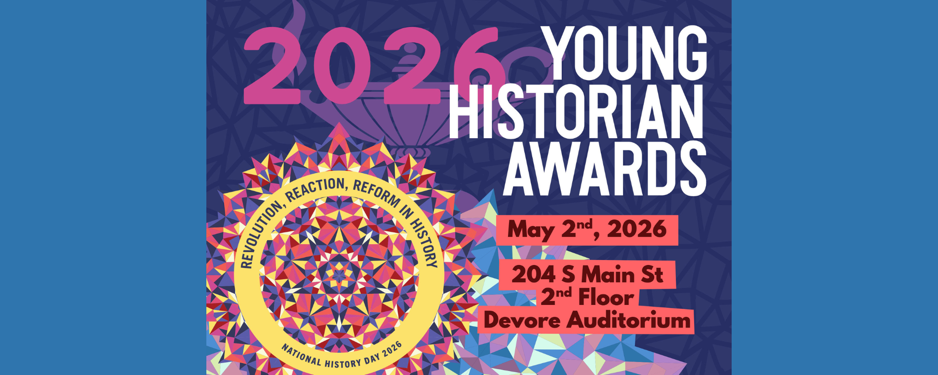 <p>The Wichita-Sedgwick County Historical Museum's Annual Young Historian Awards feature and further celebrate local students who participated and placed in the District 6 Kansas History Day contest, along with the winners of the Museum's DeVore Essay Contest.<br><br>About 2026 Kansas History Day<br><br>Achievements by the community’s young historians are recognized with awards through the National History Day competition on February 27th. The 2026 theme is “Revolution, Reaction, Reform in History.” Each year, the Kansas District 6 competition is hosted by Friends University and supported by the Wichita-Sedgwick County Historical Museum. Area students complete projects in one of five categories: documentary, exhibit, paper, performance, or website. After completing their project, students compete at the local level. The top students from all 50 states, D.C., U.S. territories, and international schools are invited to compete in the National Contest. For more information visit: http://www.kansashistoryday.org/ .<br><br><br>About National History Day® (NHD)<br><br>NHD is a non-profit organization based in College Park, Maryland, that seeks to improve the teaching and learning of history. The National History Day Contest was established in 1974 and currently engages more than half a million students every year in conducting original research on historical topics of interest. For more information, visit http://nhd.org .<br><br>About the DeVore Essay Contest<br><br>Sponsored by the DeVore Family Fund, the Wichita-Sedgwick County Historical Museum hosts an annual Essay Contest, based on the current National History Day theme. Two winners, one winner from each of the following grade ranges (6-8 & 9-12), will receive a $250 prize! For more information and contest rules, go to https://www.wichitahistory.org/devore-essay=contest/.</p>