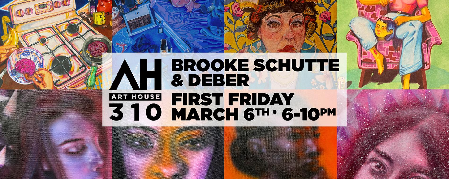 <p>Art House 310 First Friday – Brooke Schutte & Deber<br>Opening Reception | First Friday March 6th, 2026 | 6-10pm<br><br>This event is free to attend and open to the public. Show hangs through March 22nd, 2026.<br>Art House 310 is located at 310 S. Laura. Two blocks SE of Douglas & Washington in downtown Wichita.<br><br>NOTE: Open gallery hours throughout the exhibition are generally Tuesday and Thursday, 6-9pm and Sunday, 1-4pm.<br><br>BROOKE SCHUTTE<br><br>My name is Brooke, I am a 25 year old artist originally from Colorado. I was raised in a very strict, dominating, and isolating religion and have struggled with a complicated relationship with interpersonal connection, mental health, and generally society as a whole. Very early on in my childhood, I found a voice in art. More so, a purpose as well. The people around me didn’t want to hear me speak, they didn’t value my voice.. But the pretty picture I drew – that was considered valuable.<br><br>As I grew older and experienced life in a more raw and unfiltered way, I realized art was no longer what I thought it was: Realism, landscapes, still lifes. Art could be edgy, it could be problematic, and it could make my mom very uncomfortable.<br><br>Being a self taught artist, I never identified with one genre or medium. Rather, I always just pursued what spoke to me at the time.<br><br>For this show, I chose to speak on mental illness and addiction. Something that in recent years has been at the forefront of my life. When conceptualizing this show, my idea was to keep the subject matter light and playful – humorous and easy on the eye. Exploring the juxtaposition between a sensitive topic like alcoholism or PTSD, while displaying it with bright vibrant, even whimsical imagery.<br><br>I stuck with two mediums, marker and acrylic but did not necessarily commit to one style or point of view. I’d like to think my voice and personal method speaks clearly through each piece. And hopefully the audience will be intrigued to divulge into introspection while they view the work.<br><br>See more of Brooke’s work on Instagram: @masticated.gum<br><br>DEBER<br><br>My work centers on compositions that blend traditional realism, abstract expressionism and letterform abstraction. Mix media as a preference: Acrylics, Oil, Enamel mixtures, Spray paint and Airbrush are used to create layered compositions that evoke emotion, movement, and tension.<br><br>A core focus of my work lies in bridging the worlds of professional muralism, portrait painting, fine arts and Graffiti.<br><br>My canvas work serves as an extension of his street practice, offering a different format through which to explore similar ideas with nuance. For me, art is not a means to an end, it is the end itself. Through each piece, I invite the viewer into the emotional landscape and visual rhythms that define my voice as a well rounded contemporary artist.<br><br>See more of Deber’s work on Instagram: @deber614 and on Facebook: @deber614<br><br>www.ArtHouse310.com<br>Facebook | @ArtHouse310, Instagram | @ArtHouse310, TikTok | @AngieAwesomePants</p>