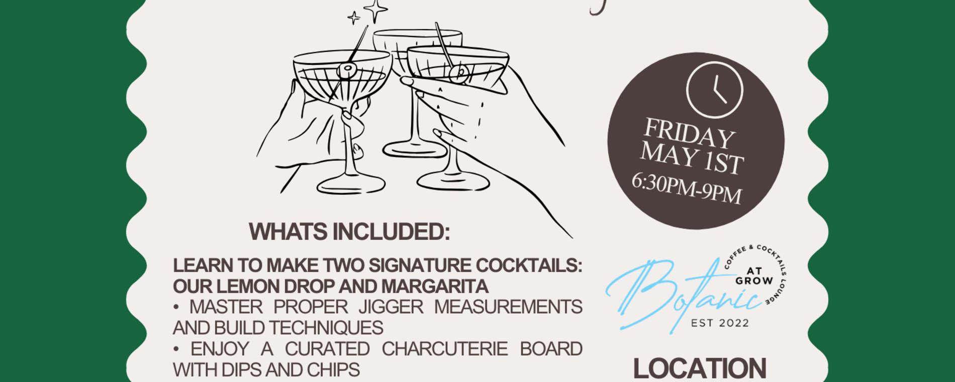 <p>TAKE YOUR HOSTING GAME UP A LEVEL <br><br>Join us at Grow for a hands-on bartending experience that will turn you into the MVP of your next patio night.<br><br>For 2.5 hours, you’ll learn the fundamentals of crafting cocktails with precision, style, and just the right amount of flair. No guesswork, no sloppy pours…just elevated, intentional drinks.<br><br> What’s included:<br>• Learn to make TWO signature cocktails: our Lemon Drop and Margarita<br>• Master proper jigger measurements and build techniques<br>• Enjoy a curated charcuterie board with dips and chips<br>• Create your own mini plant in one of your cocktail glasses to take home <br>• A relaxed, social atmosphere perfect for date night or a night out with your bestie<br><br>Whether you’re hosting friends or just tired of making mediocre drinks at home, this class gives you the confidence and skills to do it right.<br><br> $75 per person<br> Grow<br> Friday Night, May 1st<br><br>Spots are limited.</p>