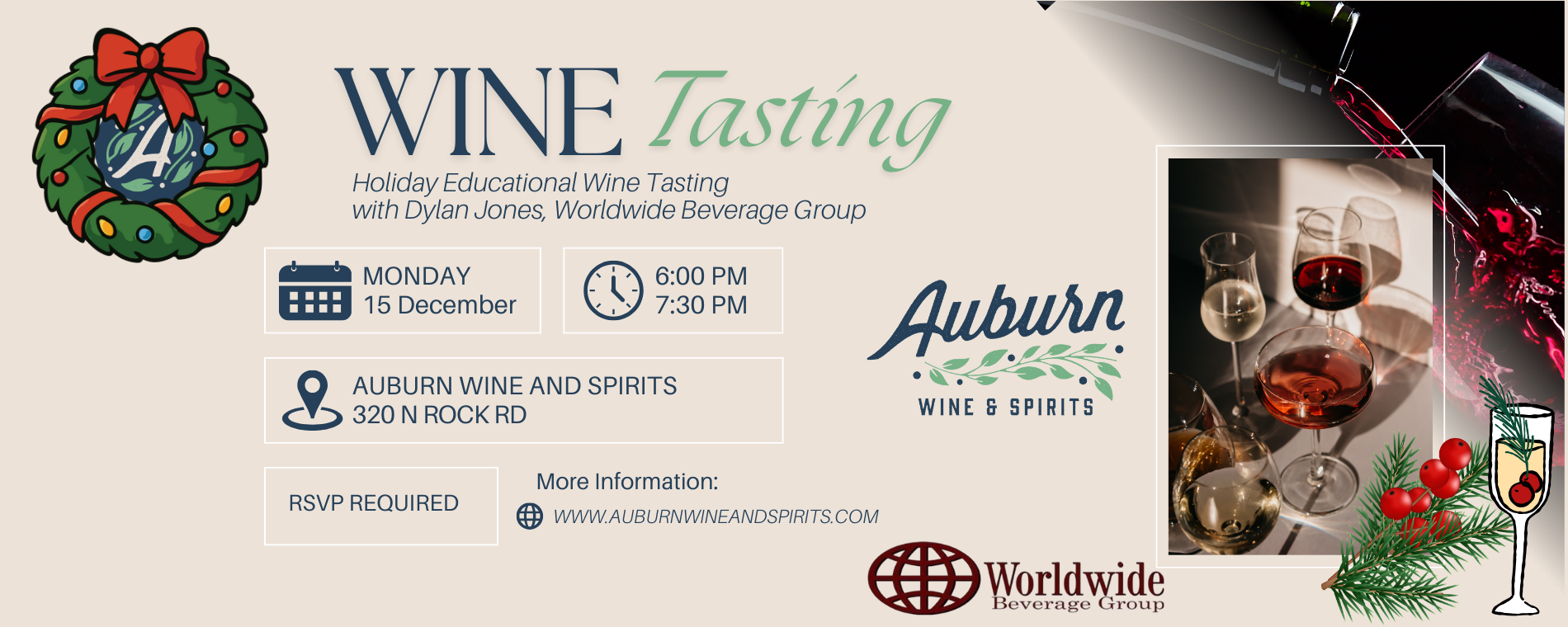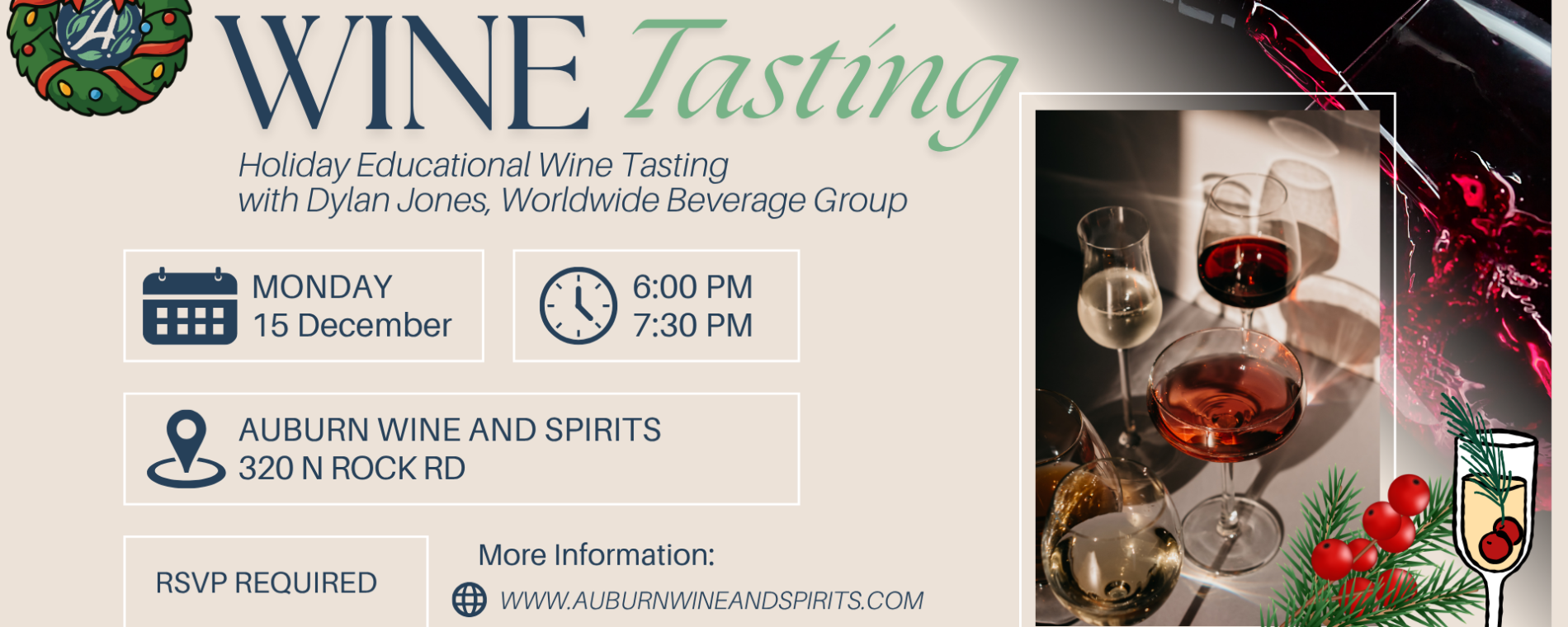 6-7:30 PM, December 15, 2025 | Auburn Wine & Spirits, LLC
