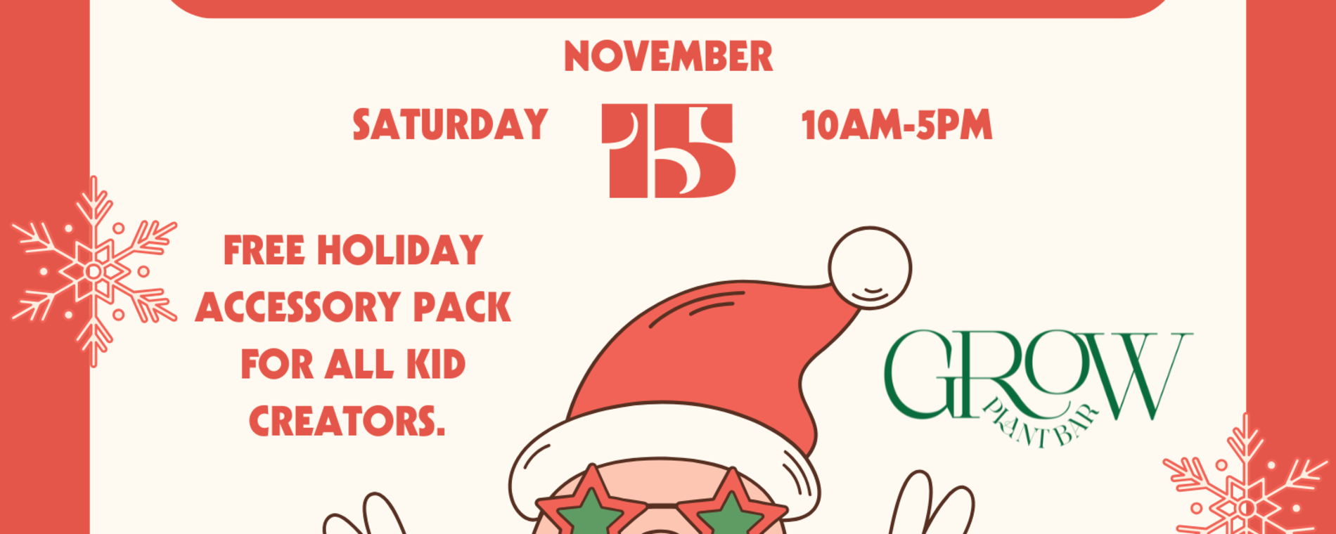 <p>- Limited-edition Kid Ornament release (while supplies last!)<br>- Paint-n-Pots & Terrarium Building<br>- Festive Coloring Station<br>- Free Holiday Accessory Pack for all kid creators<br>- Create something special for your Thanksgiving hosts or just enjoy the magic of GROW’s holiday flip!<br>- Kids are always welcome to create at GROW, but this Saturday is all about them. Bring your little ones, sip something cozy, and make some holiday memories together</p>