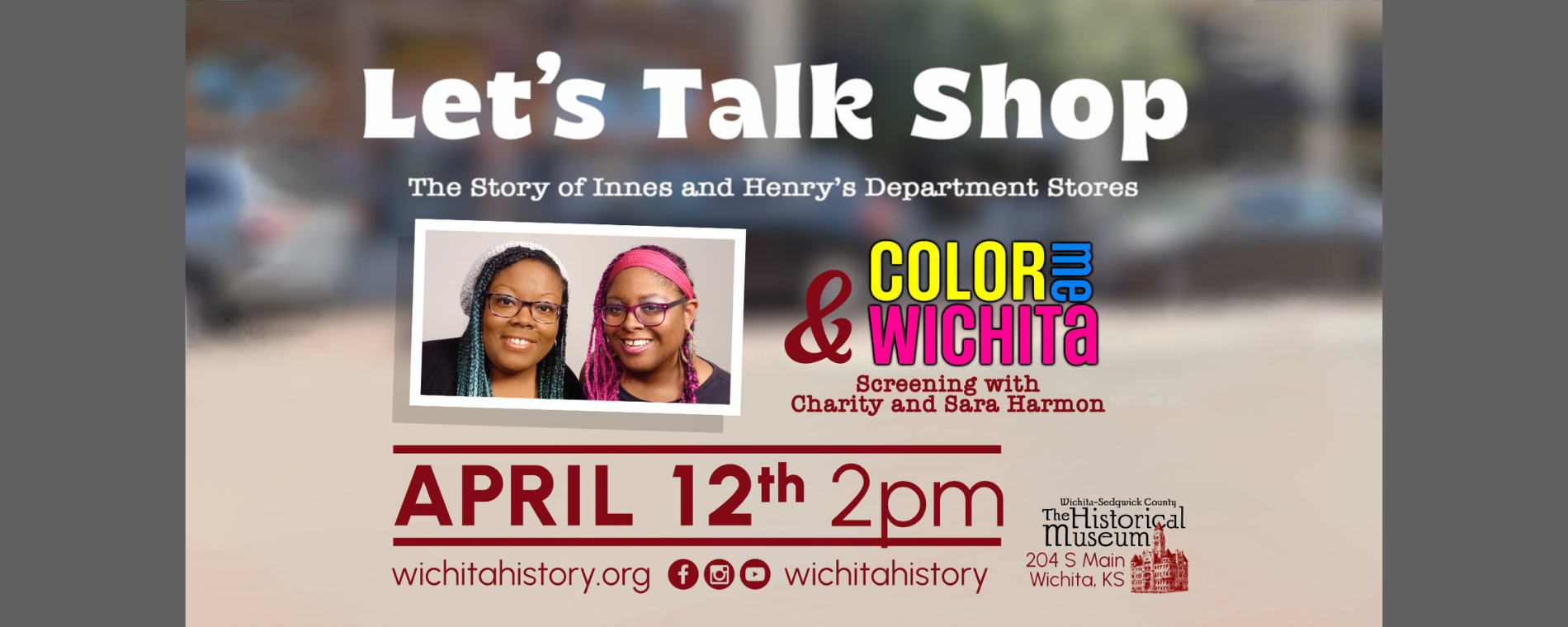 <p>Join us for an afternoon with WeHarmonSisters! We'll kick off the afternoon with a screening of their newest episode in the "Color Me Wichita" series, followed by their newest documentary, "Let's Talk Shop," that premiered at last year's Tallgrass Film Festival<br><br>About "Color Me Wichita"<br><br>Sara and Charity Harmon are award-winning filmmakers with a desire to return to their roots of traditional, hands-on art projects. Each episode, they spotlight a local artist who specializes in a certain medium, and the sisters attempt to create something in that same style.<br><br>About "Let's Talk Shop"<br><br>Sisters and award-winning filmmakers, Sara and Charity Harmon, tell the history of Wichita's two biggest department stores: Innes and Henry's. Though these stores no longer exist, the former buildings are being repurposed for higher education.<br><br>Learn more at:<br>https://www.shoutwichita.com/harmon-sisters-lets-talk-shop/<br>communityvoiceks.com/2025/10/24/harmon-sisters-lets-talk-shop-documentary-wichita/<br><br>About WeHarmonSisters:<br><br>Sara and Charity Harmon, known as "WeHarmonSisters," are award-winning Wichita filmmakers. Their films include For Your Amusement, Who Scammed Rajah Rabbit?, and their latest, Let's Talk Shop. They began their media journey as teenagers before choosing it as a career and graduating with degrees in Communication. The sisters create fun, artsy, humorous content that educates as well as entertains their audience.</p>