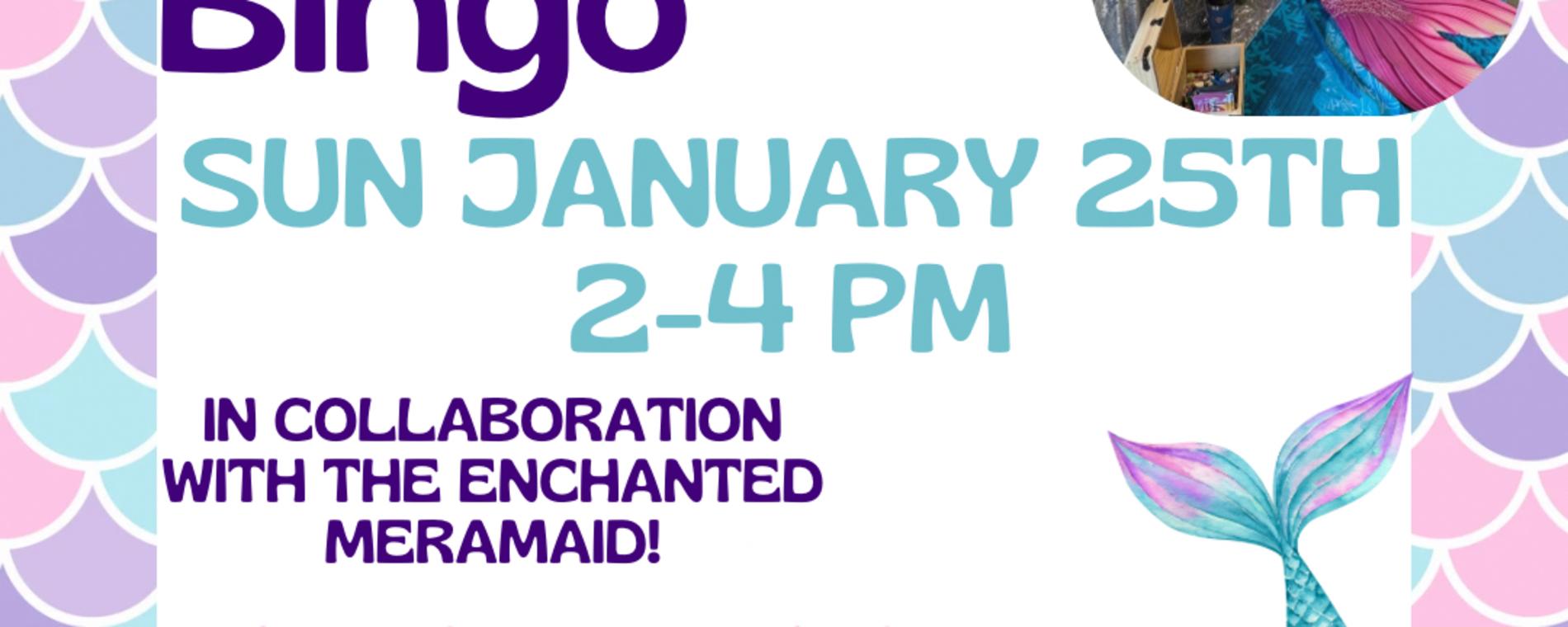 <p>Grab your lucky shells and get ready to shout “Bingo!”, because we’re diving into Mermaid Bingo with The Enchanted Mermaid!!! Join us on Sunday Jan 25th at 2 pm for fin-tastic fun, whimsical prizes, and plenty of mer-magic as our enchanting mermaid brings tides of luck your way! </p>