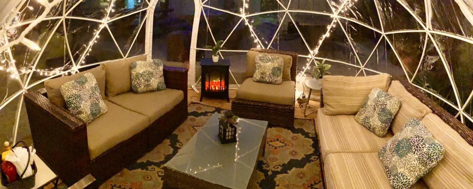 Each igloo has its own cozy electric fireplace heater, a dedicated Bluetooth speaker and seating for up to 8 people. We block off every igloo for 30 minutes after each guest to clean and sanitize. Our full food and drink menus will be offered with a server to take care of anything you need.