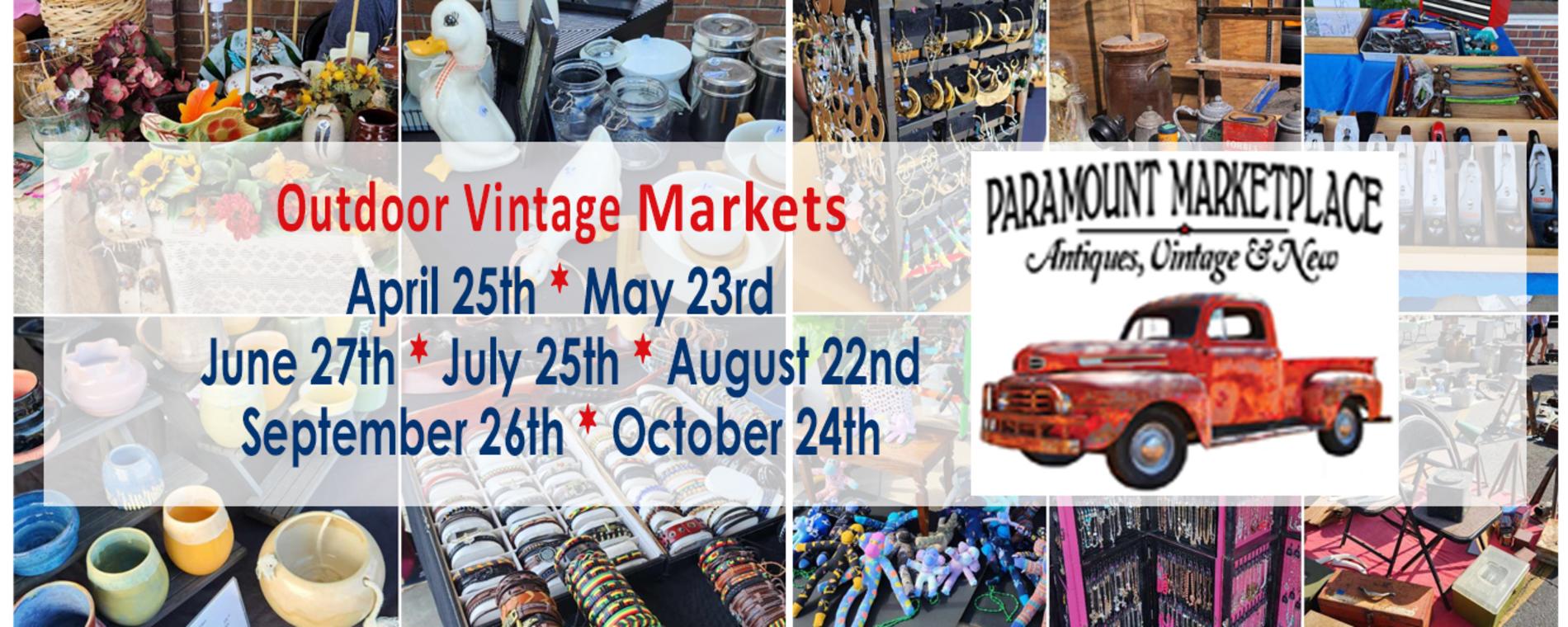 <p>Paramount Marketplace’s Outdoor Vintage Markets are a great place to hunt for treasures! The 4th Saturday of the month from April through October. There will be lots of booths set up outside the store with antiques, vintage goods, home & garden décor, jewelry, advertising, furniture, handmade goods & so much more!! Paramount Marketplace is located at 13th & Woodlawn in Wichita Kansas. Outdoor Vintage Markets are open outside the store from 9 am - 3 pm. Plus you can shop inside the store on market days from 9 am - 6 pm and save 10% store-wide. Call 316-260-6316 to reserve a booth space! Spaces rent for $35! Markets are rain or shine! Plenty of parking available in the parking lot in front of the store. FREE ADMISSION! Hope to see you there!</p>