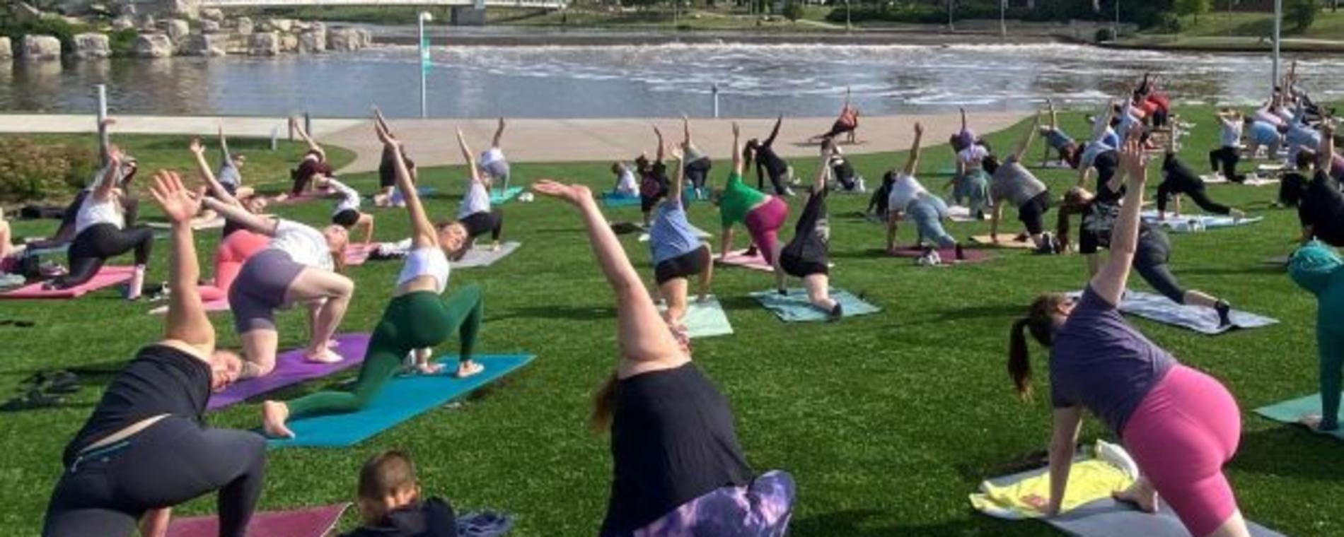 <p>Every Saturday morning (May 9 – September 19), join us for a free community yoga and/or Zumba session along the scenic Arkansas River in the Wichita Foundation Amphitheater. Whether you’re well-experienced or new to the practice, this is your chance to flow and move under the open sky and connect with others in a beautiful outdoor setting overlooking the Keeper of the Plains.</p>