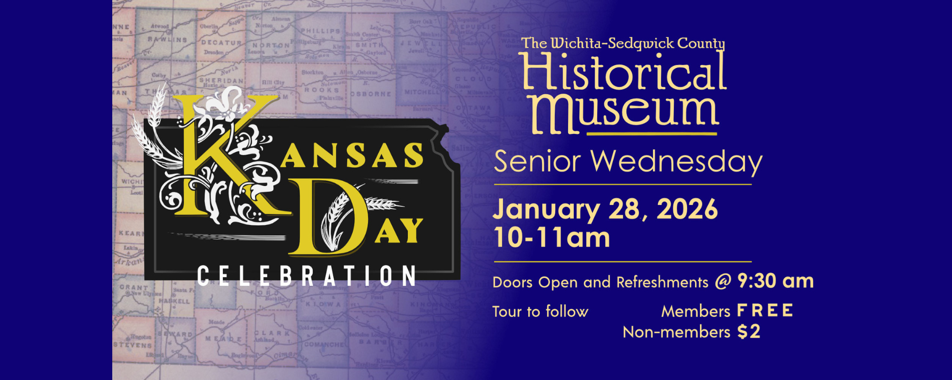 <p>A celebration of statehood in song and verse!<br><br>Over the past several years, it has become a tradition at the Wichita-Sedgwick County Historical Museum to celebrate Kansas statehood with live performances in song and verse, harkening back to the cowboy years of Kansas. Kansas joined the Union in 1861 as other states left to form the Confederacy, leading to the Civil War. Sedgwick County and the City of Wichita were established 9 years later, in 1870, during the height of the cowboy era.<br><br>Before joining us on Sunday, February 1st, for our Kansas Day Celebration, local performers will put on an hour-long performance for a special Kansas Day Senior Wednesday on January 28th!<br><br>Doors open at 9:30am<br>Non-Member Admission Fee – $2 (Annual Memberships available starting at $25- Learn more at: Memberships)<br>Refreshments provided by the “Friends of the Historical Museum” (served prior to the program).<br><br>Program starts at 10am in the DeVore Auditorium (2nd Floor) – Tour to follow at 11am<br><br>(Due to capacity restrictions, the program has limited seating of 60.)<br><br>Senior Wednesdays are informational and entertaining sessions, designed for active seniors and offered by a collaboration of local institutions. Learn more at Seniorwednesday.org<br><br>Wichita-Sedgwick County Historical Museum offers its Senior Wednesdays on the 4th Wednesday of each month, January-October. Topics and presenters will be announced as scheduled. Keep an eye on our website for details.<br><br>The Museum’s Senior Wednesday programs are made possible through a generous grant from the Charles and Joanne McIlwaine Foundation.<br><br>Don’t miss any of our upcoming Senior Wednesdays in 2026!<br><br>February 25th - "Life in Kansas During the Dust Bowl"<br>March 25th - <br>April 22nd - WSU Museum Studies Students Present on Their Exhibit<br>May 27th - "Let's Talk Shop" Documentary Screening<br>June 24th - Frank Lloyd Wright in Wichita<br>July 22nd<br>August 26th - Vice in Wichita<br>September 23rd - Hillcrest Centennial<br>October 28th - Museum Docents Present Their Favorites</p>