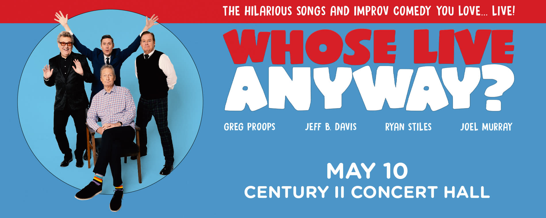 <p>WHOSE LIVE ANYWAY? is 90 minutes of hilarious improvised comedy and song all based on audience suggestions. Cast members Ryan Stiles, Greg Proops, Jeff B. Davis, and Joel Murray will leave you gasping with the very witty scenes they invent before your eyes. Audience participation is key to the show so bring your suggestions and you might be asked to join the cast onstage! WHOSE LIVE ANYWAY? showcases some of the improv games made famous on the long-running TV show as well as some exciting new ones, featuring musical direction by Laura Hall.</p>